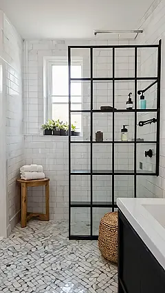 This bathroom proves that even the tiniest space can be a stylish oasis! That amazing black metal and glass shower divider is like a super cool, modern art piece, not to mention the extra storage it offers. It’s like a secret agent’s hideout for shampoos and soaps—sneaky and chic all at once! And look at that floor—it’s like stepping on tiny, happy pebbles every time you brush your teeth! Who needs a huge bathroom when you can have this much personality in a small one?