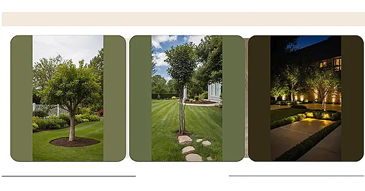 When you add landscaping around the base, especially with lighting like in this picture, the whole vibe changes after dark. Suddenly, those trees aren’t just standing there; they’re glowing! It’s like they’re throwing a secret disco party while everyone inside is asleep, with the little lights acting as mini-spotlights on the dance floor (which is the grass, obviously). This kind of setup doesn’t just make the trees look dramatically cool; it makes your entire yard feel way more inviting and a little bit magical, like something straight out of a fancy movie scene every time you look outside.