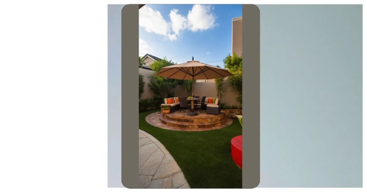 This backyard patio design is so inviting, it practically puts out a giant welcome mat for all your chill-out needs! Just look at that cool, raised stone platform – it’s like a mini-stage for all your best moments, whether you’re munching on snacks or just kicking back with friends. Those super comfy-looking cushions on the sectional sofa are practically begging you to sink in, and the big umbrella means you won’t have to play hide-and-seek with the sun’s rays. It’s definitely a level-up from just a patch of grass; this is where comfort meets outdoor coolness.