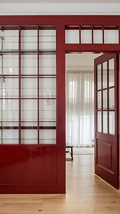 This picture is like a secret passageway to a super stylish red room! Imagine walking through that gorgeous, deep red door, and discovering a space filled with possibilities. The rich red paint and the cool, almost Japanese-inspired, glass panels create a mysterious vibe that’s both elegant and fun. It’s like stepping into a movie scene, ready for adventure – maybe even a daring escape from the villain’s lair (but hopefully with more comfy furniture!).