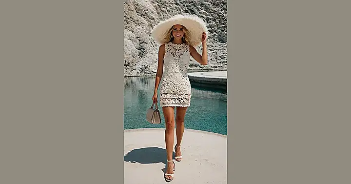 Striding out like a total boss in this amazing crochet-inspired dress, you just know you’re ready for whatever the sunny day throws your way. That intricate, lacy pattern on the dress isn’t just super cool to look at; it’s practically wearable art! And honestly, that giant, fabulous hat isn’t just for keeping the sun off your face – it’s basically a personal shade umbrella, guaranteeing no bad hair days or awkward squints, so you can flash that bright, confident smile all day long. It’s the kind of outfit that makes you want to skip, not just walk, right into your next grand adventure by the water.