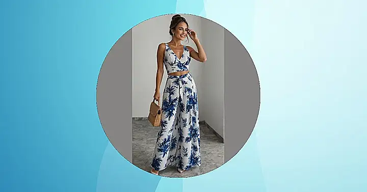 Who needs homework when you can practically smell the ocean just by looking at this outfit? This awesome blue and white floral two-piece is screaming ‘vacation mode activated!’ You know those days when you just want to ditch your usual jeans and feel like you’re about to board a flight to somewhere sunny? Well, this breezy crop top and wide-leg pant combo, complete with a super cute straw bag, pretty much guarantees you’ll look like you just stepped off a postcard, even if you’re just going to the mall.