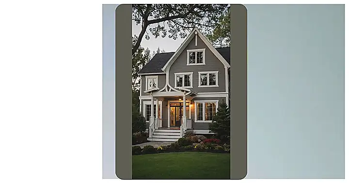This house is like something out of a fairytale! It’s got all the right ingredients for a cozy and adorable home: a charming porch, a classic grey exterior, and even a little bit of greenery around the yard. It’s the kind of house you’d imagine a friendly family living in, with a big welcoming smile on their door, always ready to offer a warm cup of cocoa on a chilly evening.
