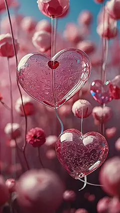 These glass hearts hanging amidst a field of blushing blossoms are seriously the cutest things ever! Imagine walking through this dreamy scene, each step crunching on soft petals as these delicate, heart-shaped balloons bob gently in the breeze. It’s like a Valentine’s Day card came to life! You could totally spend hours getting lost in this picture, daydreaming about romantic picnics and secret crushes – it’s the perfect wallpaper for anyone who loves a little bit of whimsical sweetness in their life.