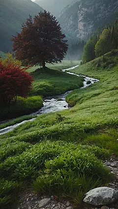 That big old tree in the middle is like the guardian of this magical place. It’s seen it all – the changing seasons, the sunrises and sunsets, and the happy little critters that call this valley home. And even though the leaves are a little bit red, this place is still green and vibrant, like an evergreen landscape that never fades away. It’s like nature is saying, “Hey, things might change, but I’m always gonna be here for you.”