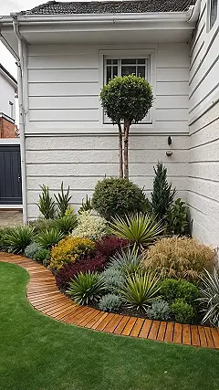 Then, just when you thought the plant party couldn’t get any fancier, there’s this sleek, curvy wooden pathway, looking like a red carpet rolled out just for you, leading to unknown garden adventures (or maybe just the front door). It’s perfectly edged by a carpet of super green grass that looks so soft, you’d probably want to ditch your shoes and just roll around in it like a happy puppy. This entire front garden landscape is basically telling other houses, “Yeah, we put some effort in!” It’s a beautifully designed welcome mat, making you feel like you’re entering a cool nature exhibit before you even ring the doorbell.