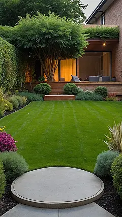 Wow, check out this backyard! It’s like stepping into a magazine, only way more fun. Imagine chilling out after school, maybe with some friends, on that super-smooth patio thing (is it a giant frisbee?). The perfectly manicured lawn is begging for a game of tag, and that gorgeous tree is totally Instagram-worthy. This home front garden is seriously goals!