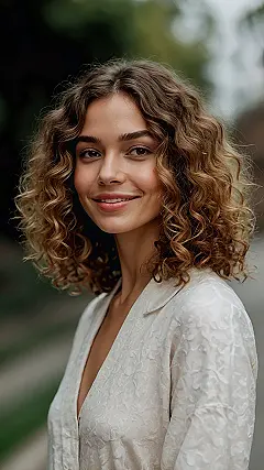 Sometimes, curly hairstyles might seem to have a mind of their own, making you wonder if they’re trying to communicate in a secret language of frizz and volume. But that’s exactly what makes them so unique and charming! This friendly smile, perfectly framed by those golden-brown waves, shows off how much personality curls can add. So, whether you’re rocking tight coils or loose waves, embrace the bounce – because your hair isn’t just a style, it’s a whole mood!