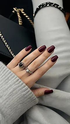 These nails are seriously giving us all the autumn vibes! They’re like a cozy, warm hug on a chilly fall day. That deep burgundy color is so rich and elegant, and it’s the perfect way to transition your look from summer to fall. Plus, the shine is totally on point – it’s like the leaves are reflecting all the golden sunlight!