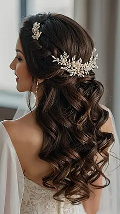 Wow, check out those luscious locks! This isn’t your grandma’s bridal hairstyle; it’s totally modern and stunning. The loose curls are like a waterfall of dark chocolate, and that sparkly hairpiece adds just the right amount of “bling” without being over-the-top. It’s the perfect blend of romantic and sophisticated—definitely jaw-dropping! Imagine how amazing this would look walking down the aisle, with everyone gasping “Oooooh!”