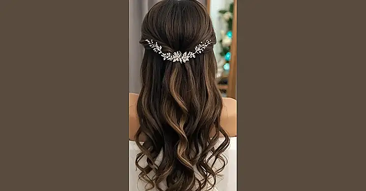 This hairstyle is seriously stunning! Imagine walking down the aisle with these gorgeous, bouncy curls and that sparkly hairpiece. It’s like your hair is doing a little happy dance – all twirls and shine. You’d totally steal the show, and your Instagram would be blowing up with likes! It’s the perfect blend of elegant and fun, not too fussy, but still totally jaw-dropping.