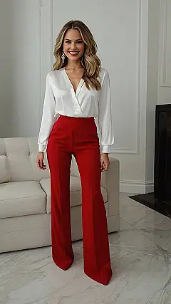 This outfit is perfect for any Christmas event, whether you’re hitting up a family gathering or a festive party with friends. The white blouse keeps things classy and elegant, while the bold red pants add a pop of holiday cheer without being too over-the-top. It’s comfortable enough to dance the night away and stylish enough to make you feel like a total queen! Plus, it’s easy to accessorize – just add some sparkly earrings and you’re ready to jingle all the way!
