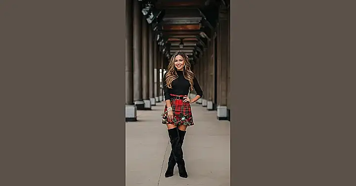 Imagine all the compliments you’ll get! This look is so easy to copy, too. You could find similar pieces at almost any store, and it’s totally adaptable. Swap the plaid skirt for a different color or pattern if you want to personalize it. Maybe even add a sparkly sweater instead of the black one for extra glam. It’s all about having fun and finding what makes you feel most confident and festive this Christmas season.