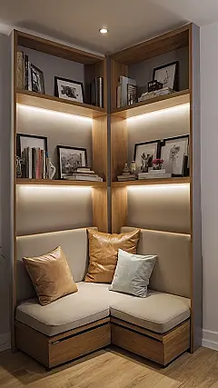 This built-in corner seating is the ultimate chill zone! Imagine curling up with a good book, surrounded by your favorite photos and the soft glow of built-in lights. It’s like your own little library, but way more stylish. Forget boring bedrooms, this setup is pure cool room decor perfection – a comfy reading nook, stylish shelving, and the perfect spot for some serious relaxing.