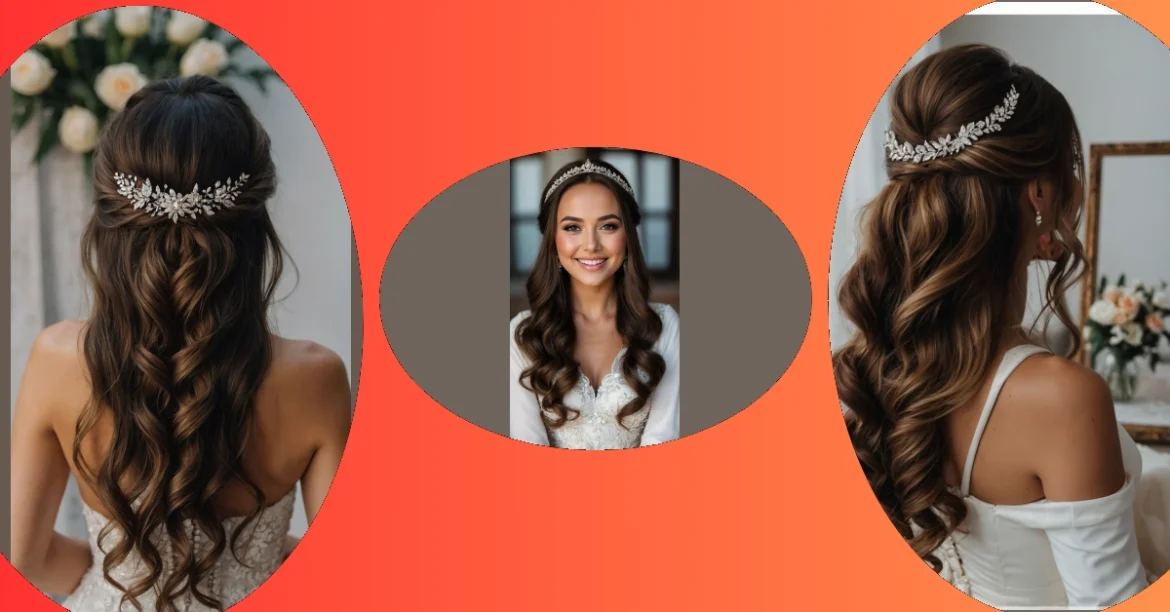 Getting your hair perfect for a big event can feel like a mission, but this bride absolutely nailed the “classic with a twist” look! Her beautiful long, wavy hair is styled in a half-updo, which is basically the best of both worlds: fancy enough to feel super special, but also practical enough to keep those gorgeous strands out of her face while she’s busy celebrating. And can we talk about that sparkly hairpiece? It’s not just an accessory; it’s a tiny, glittering crown that screams, “I’m here to look amazing and probably shed a few happy tears!”