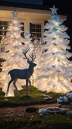 Check out this amazing outdoor Christmas display! Two fluffy white Christmas trees, sparkling with lights, look like they’ve been dusted with fresh snow. And get this – a majestic reindeer is casually chilling underneath them, probably waiting for Santa to drop off some extra-special Christmas cookies. It’s like a scene straight out of a Christmas movie, but even better because it’s real! These “outdoor Christmas decorations” are seriously next level.
