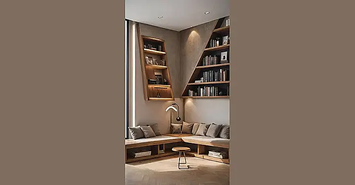 Check out this study room! It looks like someone told a bookshelf to do the Macarena and it just froze mid-dance, creating these wild, zig-zagging shelves. With lights tucked inside, your textbooks will practically glow, hinting at all the amazing knowledge they hold (or maybe just how late you’ll be up studying!). It’s the kind of decor that might just trick you into thinking homework is an adventure through a wooden maze instead of, you know, actual homework.