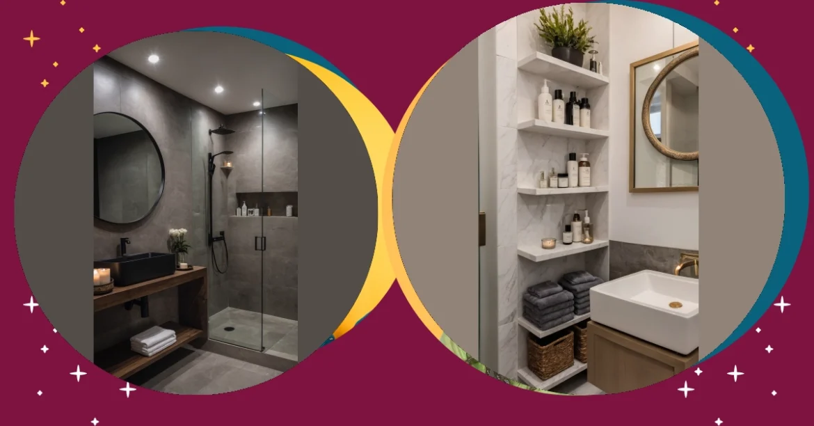 Forget about your bathroom just being a place to brush your teeth; this image shows how it can be a total vibe! Check out those sleek marble-look shelves, perfectly organized with all sorts of fancy-looking bottles. Are they super special lotions, amazing shampoos, or maybe even potions for superhero powers? Who knows! But they sure look great, lined up like a pro display. This kind of smart bathroom decor isn’t just for show; it makes everything feel tidier and way more grown-up than just having your toothpaste tube chilling on the sink.