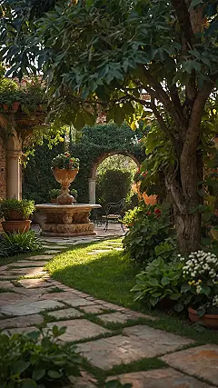 This Italian patio looks so fancy, it might just judge your questionable snack choices. That giant fountain definitely looks like it’s seen things, probably involving someone accidentally dropping their gelato centuries ago. Walking on that cool stone path surrounded by greenery just feels *right*, like you could finally understand poetry or just take the best nap ever under that big shady tree. It’s the kind of place that makes your own backyard look like a parking lot with a single sad potted plant.