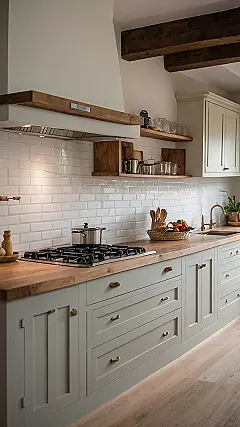 Step into this kitchen, and suddenly you’ll feel like a culinary genius, even if your usual masterpiece involves microwaving pizza rolls. This isn’t just a place to grab a snack; it’s a full-blown designer kitchen where the light grey cabinets and warm wooden countertops make everything look incredibly fancy. It’s so stylish, you might actually start wondering if your burnt toast has secret gourmet potential, perfectly paired with that sleek subway tile backsplash. Who knew cooking could look this good?