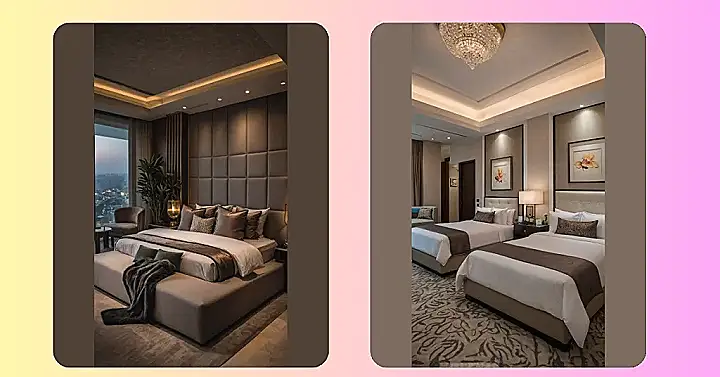 Beyond the irresistible bed, the whole vibe of this deluxe room just screams ‘fancy slumber party’! Those sleek wall panels with the hidden glowy lights make the room feel super modern, like you’ve stepped into a secret VIP lounge. And those funky gold lamps? They look like they’re ready to host their own tiny disco, or at least help you find your phone without stubbing your toe. It’s the kind of place where even your socks would feel special, definitely a step up from a regular room, making every moment feel extra awesome.