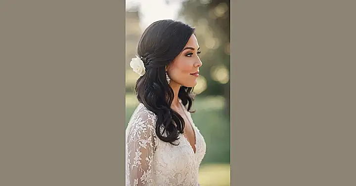 Planning a wedding can feel like a super fancy scavenger hunt, but at least finding amazing hair ideas doesn’t have to be hard! Take a peek at this bride’s stunning look: beautiful dark waves, half-up and half-down, with a sweet twist keeping everything perfectly in place. And that fresh white rose tucked in? It’s not just pretty, it’s also probably super helpful for hiding any stray hairs that tried to escape the party! This style says, “I’m elegant, but I’m also ready to hit the dance floor without my hair getting in my champagne.”