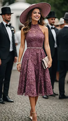 And can we talk about that hat? It’s like the ultimate accessory, adding that extra sprinkle of ‘wow’ that makes the whole outfit pop. It says, “I’m sophisticated, but also, I might be plotting how to catch the bouquet… stylishly, of course.” From the elegant high neck to those perfectly matched shoes and clutch, this look is giving off major confident vibes. It’s a prime example of how to nail ‘wedding guest chic’ – looking put-together and ready for a fun day of celebrating love (and cake!).
