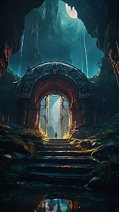 This image is like a seriously cool wallpaper for your phone or computer. It’s got this epic stone archway, all mysterious and ancient-looking, like something straight out of a video game or a fantasy novel. Imagine it: you’re a brave adventurer, ready to explore a hidden world beyond that gateway! There’s even a spooky moon peeking through the cave ceiling, casting magical shadows everywhere. Who needs boring old pictures of cats when you can have this amazing portal to an imaginary land?