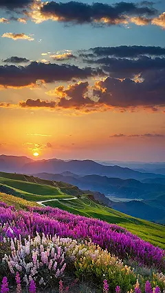 This place looks like it popped straight out of a painting, or maybe a super-fancy desktop background you’d never actually get tired of. With those hills absolutely bursting with purple and pink flowers, it’s like Mother Nature decided to spill her entire box of highlighters all over the landscape. And that sunset? It’s putting on such a dramatic, fiery show in the sky, making everything glow like it’s straight out of a fantasy movie. It’s truly one of those incredible places that makes you want to pack a picnic and just stare at it for hours, maybe with a few friendly gnomes for company.