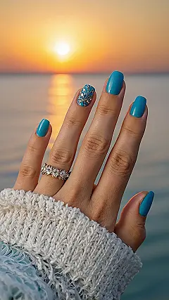 Don’t even get me started on that fancy accent nail! With its sparkly, intricate design, it’s like the little extra sparkle needed to make any summer adventure shine, whether you’re wearing a swimsuit or, you know, a random sweater over your swimsuit (fashion!). These nails, complete with a cool ring, are basically a sneak peek into the future of looking fabulous by the water in 2025. Get ready, summer, because my fingertips are leading the way!