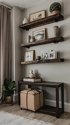 Wow, check out this room! It’s like stepping into a fancy magazine, but without needing to sell a kidney to achieve the look. Those gorgeous dark wood shelves are packed with stylish treasures – frames, vases, and even a tiny potted plant that looks like it’s wearing a terracotta hat. The whole thing feels super expensive, but I bet it was way more budget-friendly than you think! It just goes to show you that you don’t need to break the bank to have a sophisticated, amazing space.