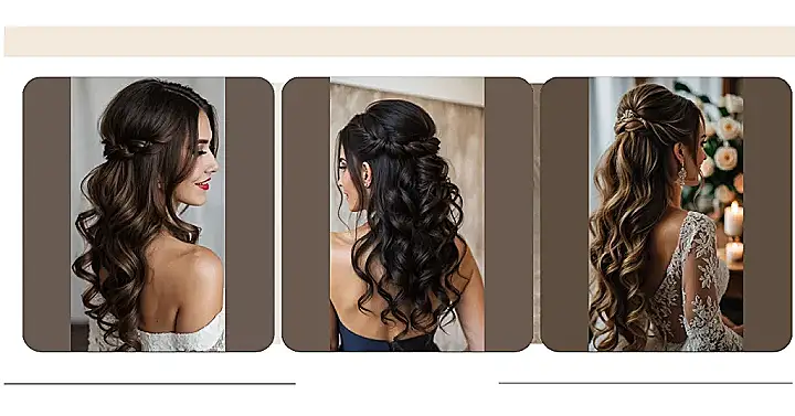 Getting ready for an autumn wedding means you want to look stunning without getting caught in a sudden gust of wind. This half-up, half-down look, with that perfectly woven braid leading into those gorgeous, flowing waves, is basically hair goals. It’s like your hair decided to be fancy but also super chill and ready for anything – from sipping apple cider to doing the electric slide without a single strand getting in your soup (we’ve all been there). It’s the kind of effortless elegance that makes everyone wonder if you just naturally woke up looking this fabulous.