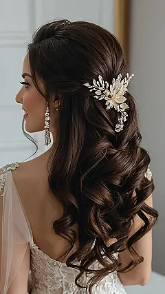 This look is elegant without being too extra, if you know what I mean. You get to keep your hair down, which is always a win, but it’s still got that “I spent hours getting ready” vibe. Plus, think about how amazing this will look in photos! Just practice your “effortless” hair flip beforehand – you know, the one that says, “Oh, this old thing? It just magically became perfect.” Good luck and enjoy your special day!