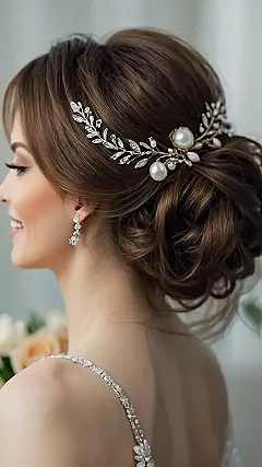 This hairstyle is totally giving us “fairy princess meets modern chic” vibes! Imagine yourself walking down the aisle, looking like a glamorous queen with this gorgeous updo. Those sparkly pearls and delicate leaves are seriously dreamy, and the bun itself is so effortlessly elegant – it’s the perfect blend of fancy and fun. It’s the kind of hairstyle that would make even your grandma say “wow!” It’s definitely on the list of trending bridal hairstyles for 2025, and we’re already obsessed!