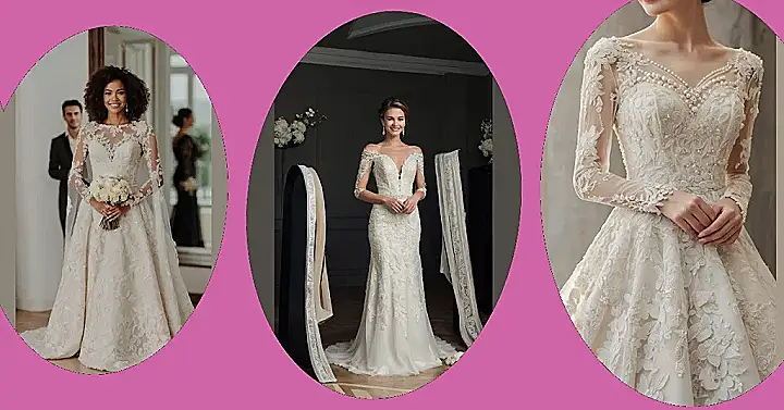 But hold on – let’s not forget long sleeves, which have come back with a vengeance! Nothing feels more classy than a long-sleeve dress that gracefully drapes along your arms. Picture an all-white mermaid gown, complete with exquisite lace that hints at timeless vintage charm. It’s like stepping into a fairy tale while still being able to show off your fabulous figure. Trust us, your wedding photos will be absolutely legendary!