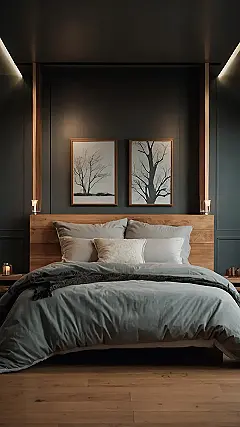 This bedroom is so cozy, it’s like sleeping in a forest…without the creepy crawlies! The dark walls and wooden headboard give it a super-chill vibe, kind of like a treehouse for grown-ups. Those pictures of bare trees? They’re totally stylish and make the room feel peaceful and calm, perfect for getting some serious shut-eye. Imagine drifting off to sleep surrounded by nature’s soothing calm — much better than counting sheep!
