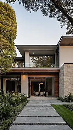 That arched front door isn’t just an entrance; it’s basically a fancy portal inviting you to a world of comfy couches and maybe a secret snack stash. Those cool lanterns flanking the door look like they’re ready for a party, and all the green plants aren’t just for show – they’re probably whispering secrets about how awesome it is to live here. This isn’t your grandma’s ranch house (unless your grandma is super hip and lives in a modern masterpiece!). It’s the kind of place where you could chill after school, kick back, and feel totally at home, probably without even having to do the dishes.