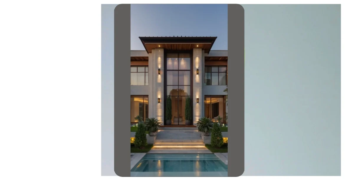 Check out this fancy villa! It’s like someone took a time machine to the past and then gave it a serious upgrade. You’ve got the classic shapes and fancy details that scream “old money,” but then you see the sleek lights and super-groomed bushes, and you know it’s not your grandma’s mansion. It’s like a history project that suddenly got Wi-Fi and a killer sound system.
