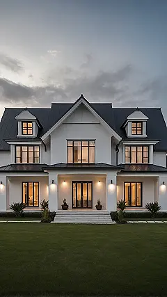 And that lawn! It’s so perfectly manicured, you could probably convince a professional golfer to practice their putting on it. This modern marvel probably comes with a self-cleaning robot butler and a fridge that restocks itself with snacks. Trying to have a messy room here? The house itself would probably send you a stern notification! It’s definitely the kind of place where you could spend an entire evening just chilling on that porch, feeling super fancy, and probably wondering if the neighbors are secretly jealous of your awesome, perfectly lit abode.