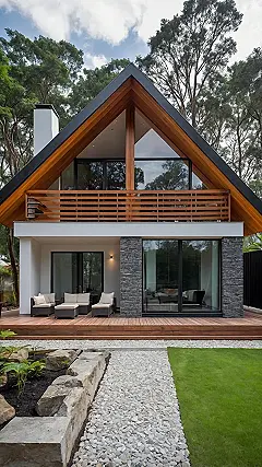 Check out this seriously cool modern 2 story house that looks like it stepped right out of a design magazine! With its sharp, pointy roof that basically screams “I’m awesome,” and all those huge windows, you’d never miss a single thing happening outside – perfect for tracking squirrels or just soaking up all the sunshine. The way they mixed the warm wood with sleek white walls and some rugged stone makes it look super fancy but also super cozy, like it’s giving you a high-five just for looking at it. Plus, that balcony on the second floor? That’s definitely where you’d have your main character moment, waving to your invisible fans.