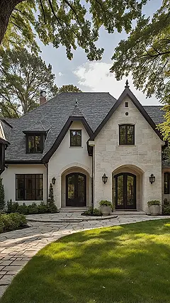 Check out this epic house! It’s like a classic fairytale castle got a super stylish modern makeover. This isn’t your grandma’s old-school Tudor; it’s a ‘Modern Tudor,’ which means it kept all the coolest bits, like those dramatically pointy roofs and fancy arched doorways, but ditched anything that felt stuffy. Those dark window frames and doors against the bright stone and stucco? Chef’s kiss! It’s giving off serious ‘main character’ vibes, like someone really cool lives here, probably with an amazing gaming setup and snack pantry inside.