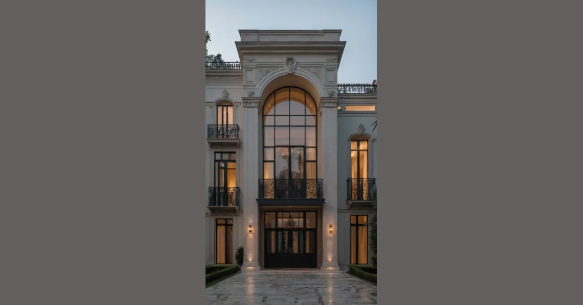 Step right up to this neoclassical villa that looks like it just rolled out of a history book, except way more polished. Seriously, check out that massive arched window! It’s so big, you could probably screen movies on it. And the front door looks like it’s waiting for someone important to walk out, maybe wearing a cape or carrying a scepter. With those grand pillars and fancy decorations, it’s like the house is putting on its best suit and tie just for you. You almost feel like you need a formal invitation to even stand on that super shiny marble walkway.