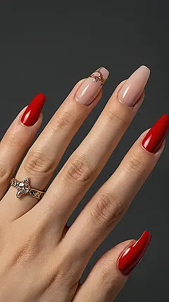 Plus, how cool is the mix? You’ve got the bold red hanging out with those chic nude ones, one even rocking some sparkly gold flakes like tiny confetti. It’s like the perfect combo of standing out and keeping it classy, all thanks to the magic of acrylics. These nails are basically a mood board for being confident and a little bit extra, proving your hands can look amazing even when they’re just holding your phone.
