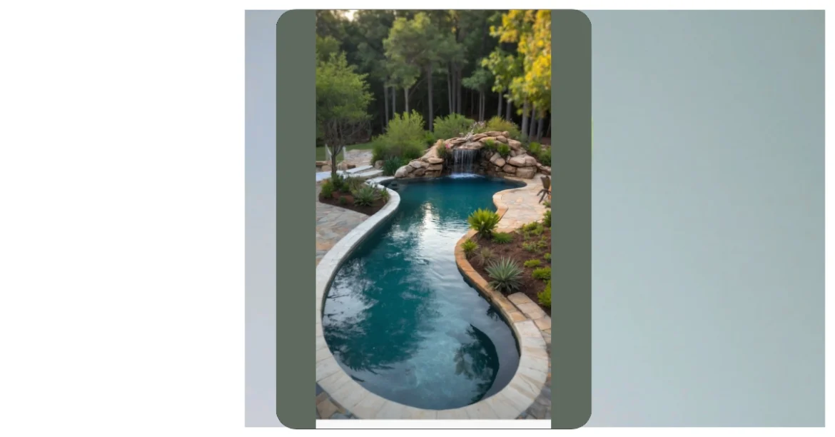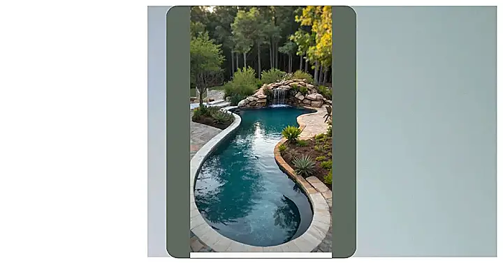 This isn’t your average backyard splash zone; this is a total aquatic adventure! Imagine lounging by a stunning pool, so curvy it looks like a lazy river took a detour into your garden. But wait, there’s more! A mini waterfall cascades down rocks, creating the most awesome, relaxing sounds – perfect for soaking up the sun and pretending you’re on a luxurious vacation. It’s like nature and luxury had a baby, and that baby is seriously stylish.
