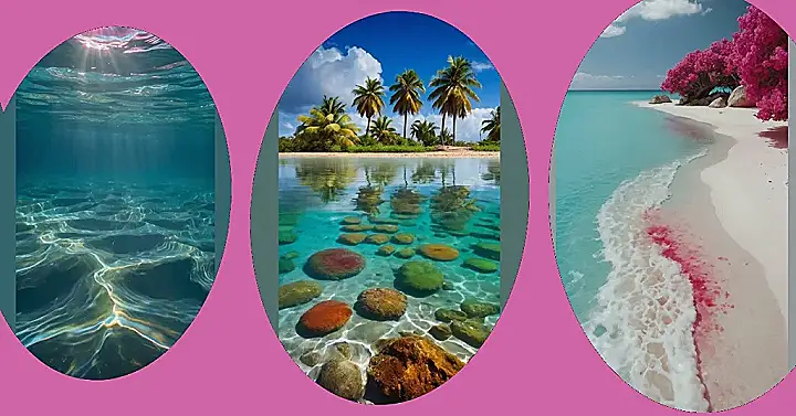 This picture is like something straight out of a dream, or maybe a really cool video game level! The water is so clear and blue, it makes you want to dive right in, even if you’re not sure what kind of weird and wonderful creatures you might find. And then, BAM, those pink flowers adding a pop of color make it super Instagram-worthy.