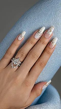 Forget plain Jane manicures; these nails are basically wearing tiny works of art! The way those intricate gold swirls and flowers are painted on each nail? It’s almost too pretty to touch anything… almost. Plus, let’s not ignore that mega-watt sparkle on the ring finger! That gem is probably brighter than my future, and together with these nails, it’s a combo that screams “I woke up like this, fabulous!” Whether you’re just chilling with friends or trying to subtly flex during your next TikTok, these milky, gold-kissed nails are definitely going to steal the show and make every hand gesture feel super extra.