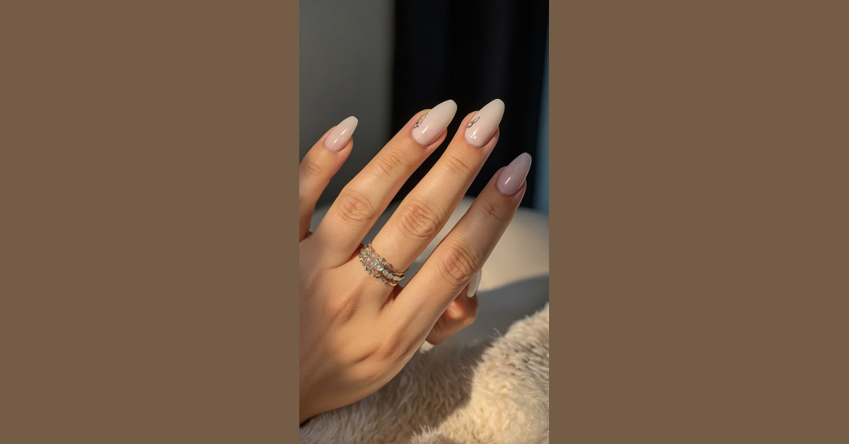 But wait, there’s more than just milky magic going on! If you look closely at a couple of those nails, you’ll spot tiny, super cool designs – almost like little hidden tattoos for your nails. It’s like they’re saying, ‘I’m sophisticated, but I also have a secret playful side!’ And can we talk about those stacked rings? They’re sparkling so much, they’re practically winking at you, making the whole hand look ready for anything from acing a pop quiz to totally rocking a dance party. It’s clear this manicure isn’t just about looking good; it’s about feeling effortlessly awesome, even if you’re just attempting to make toast without burning it.