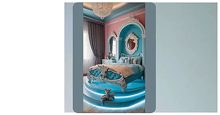 This isn’t just any old room; it’s what happens when your bedtime location gets a serious upgrade! Forget cramped bunk beds or boring walls, this place is like a fluffy, glowing cloud designed for epic sleepovers or just pretending you live in a castle. The bed itself looks so cozy, it’s probably softer than sleeping on a giant marshmallow, and those blue lights underneath make it feel like you’re floating on your own private disco floor before drifting off to dreamland. Seriously, counting sheep seems way less necessary when your room looks this cool.