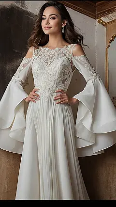 Plus, can we talk about how comfy it looks? No squeezing into some super tight gown, trying not to breathe. This dress says, “I’m getting married, I’m feeling good, and I’m ready to dance!” Seriously, those sleeves practically BEG for some dramatic hand gestures on the dance floor. Get ready to twirl your way into happily ever after!