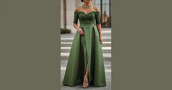 This olive green gown is the perfect blend of elegance and sass! Imagine yourself gliding into that wedding reception, feeling like a total queen in this gorgeous off-the-shoulder masterpiece. The lace top is fancy enough to impress even your grandma, while the flowy, floor-length skirt makes you feel like you can twirl all night long—and who wouldn’t want to do that at a wedding? Forget awkward photos; this dress is guaranteed to make you look amazing in every single one.